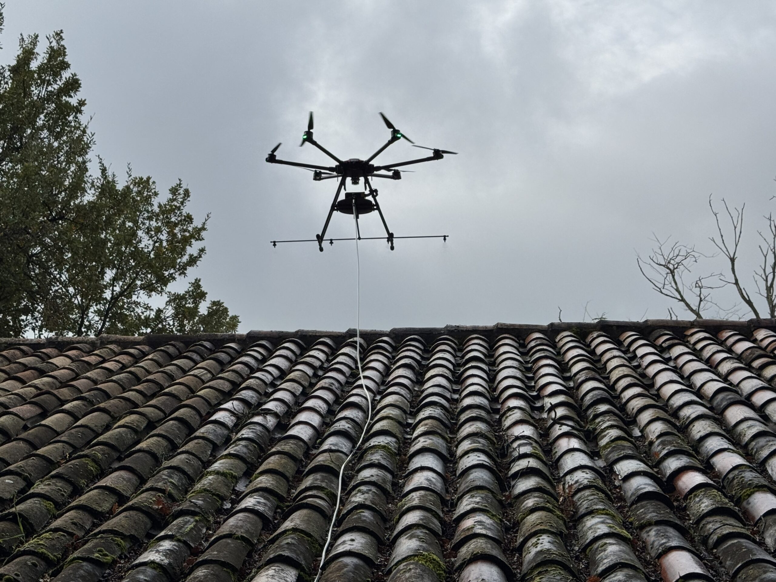 Nous disposons de drones pour assurer tous les travaux de pulvérisation : démoussage ou nettoyage sur vos surfaces de toitures, façades, bardages, etc… Nous apportons une attention toute particulière à l’utilisation de produits fongicides professionnels à base d’ammonium quaternaire.